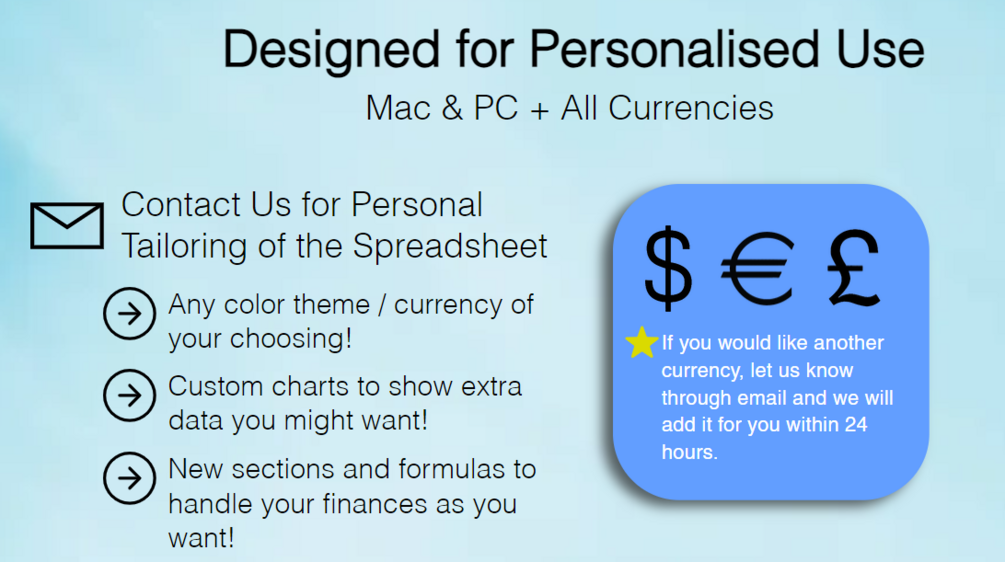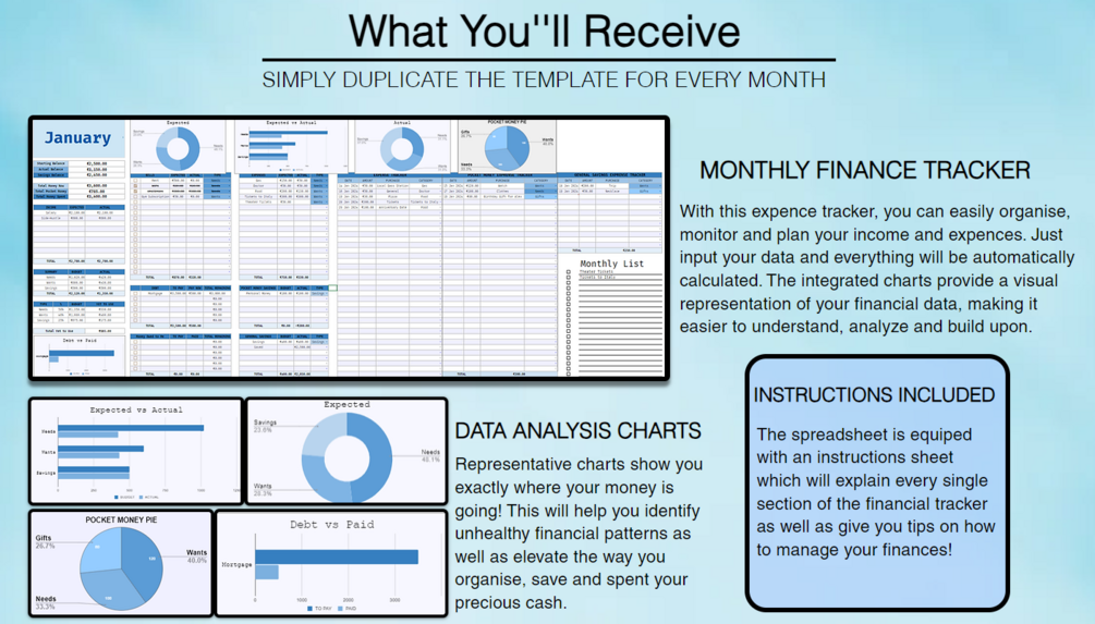 This is the ultimate monthly finance tracker for your personal use. It provides all the necessary tools to keep track of your finances, organise your income and expenses as well as being a reliable source of motivation for financial independence. This is perfect for begginers, as using this template is simple and easy. Be in control of your finances to find out where your money goes💰.